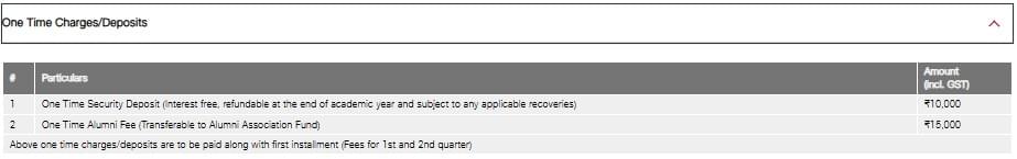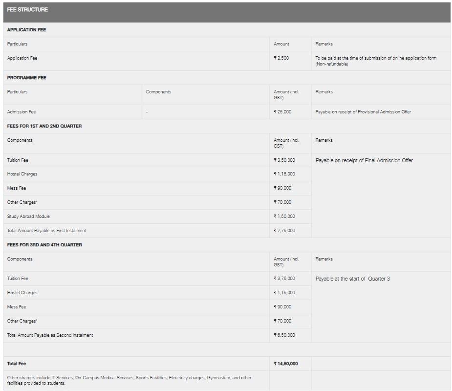 The total fee for the entire program, according to the provided fee structure, is 14,50,000. This amount is broken down into an initial Application Fee of 2,500 (non-refundable) and a Programme Fee of 25,000, which is the Admission Fee. The remaining amount is paid in two main installments for the quarters. The first installment for the 1st and 2nd Quarters totals 7,75,000, which includes Tuition Fee (3,80,000), Hostel Charges (1,15,000), Mess Fee (90,000), Study Abroad Module (1,60,000), and Other Charges (70,000) covering services like IT, Medical, and Sports facilities. The second installment for the 3rd and 4th Quarters totals 6,50,000, comprising Tuition Fee (3,75,000), Hostel Charges (1,15,000), Mess Fee (90,000), and Other Charges (70,000). All listed amounts for the Programme Fee and subsequent installments are inclusive of GST.