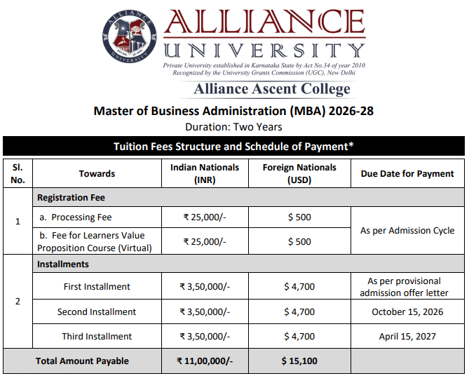 MBA Fees at Alliance Ascent College Bangalore covers a range of expenses, including tuition fee, course materials, and access to campus facilities.