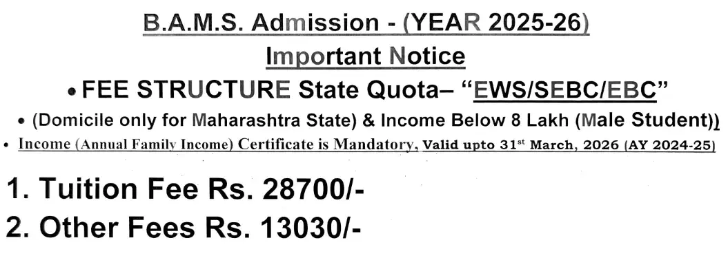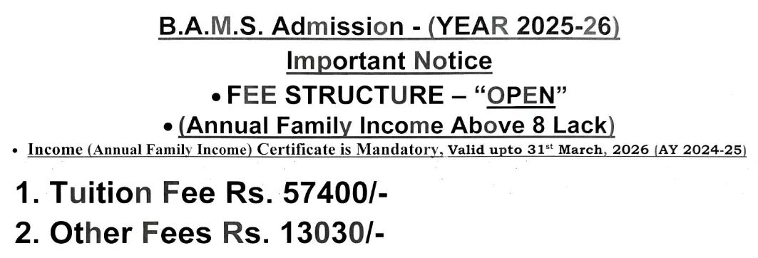 Admissions to B.A.M.S at Ayurved Mahavidyalaya & Seth R. V. Ayurved Hospital, Sion Mumbai are primarily based on Maharashtra-NEET-Counselling. Candidates must have completed 10+2+NEET to be eligible for admission. The overall Maharashtra-NEET-Counselling cutoff for the B.A.M.S program is 82974 - 500234 across all categories.