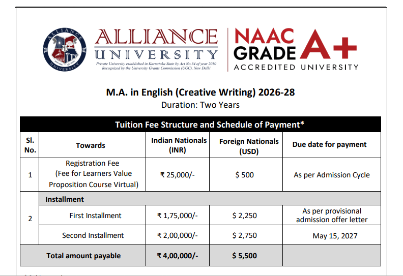 Earlier, MA English Creative Writing fees at Alliance School of Liberal Arts Bangalore was ₹ 4 Lakhs (in 2025) for the entire course duration. This shows that the fee has remained unchanged since 2025.