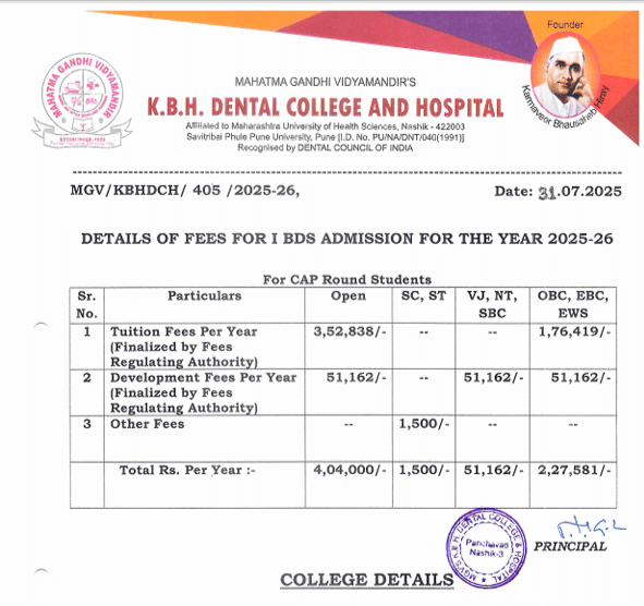 Karmaveer Bhausaheb Hiray Dental College and Hospital Nashik BDS fees in first year is ₹ 3.67 Lakhs. The detailed fees is mentioned below.Karmaveer Bhausaheb Hiray Dental College and Hospital Nashik offers a total of 100 seats for BDS . Admissions are offered based on Maharashtra-NEET-Counselling.