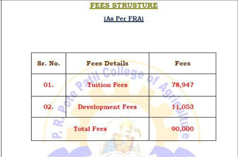 P. R. Pote Patil College of Agriculture Amravati B.Sc {Hons.} Agriculture fees in first year is ₹ 90,000. The detailed fees is mentioned below.