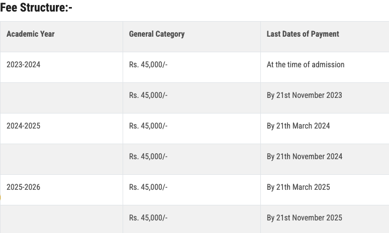 | Semester Wise Fees | ₹45000 | ₹45000 | ₹45000 | ₹45000 | ₹45000 | ₹45000 |
