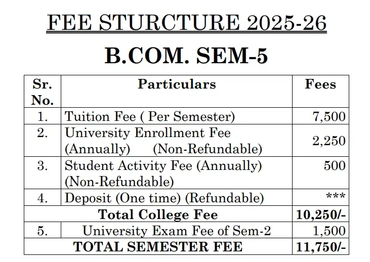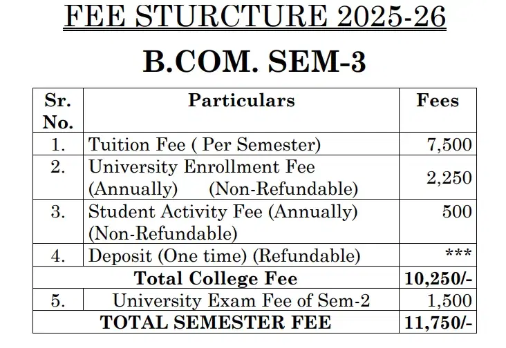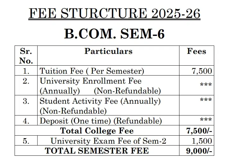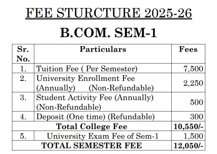 The total fee for the B.Com course (2025–26) is Rs 62,550/- across six semesters. The semester-wise fees are: Rs 12,050/- for Semester 1, Rs 9,000/- for Semester 2, Rs 11,750/- for Semester 3, Rs 9,000/- for Semester 4, Rs 11,750/- for Semester 5, and Rs 9,000/- for Semester 6. This includes tuition fees, university enrollment fees, student activity fees, deposits (where applicable), and university exam fees.