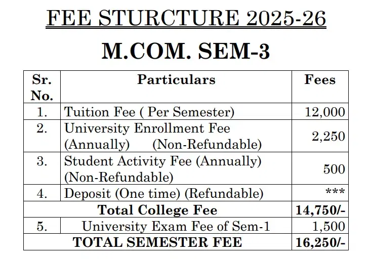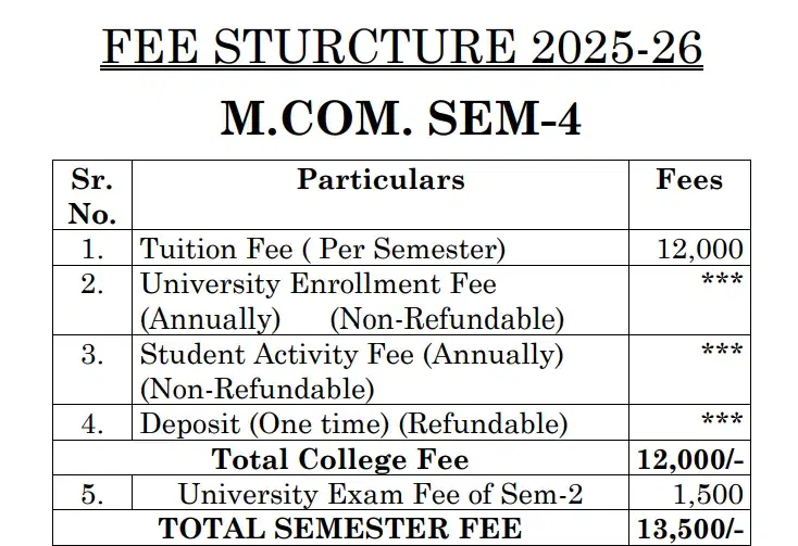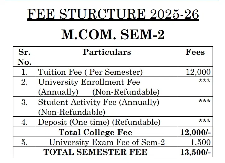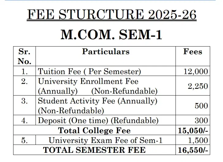 The total fee for the M.Com course (2025–26) is Rs 59,800/- spread across four semesters. The fee structure is Rs 16,550/- for Semester 1, Rs 13,500/- for Semester 2, Rs 16,250/- for Semester 3, and Rs 13,500/- for Semester 4. This includes tuition fees, university enrollment fees, student activity fees, deposit (where applicable), and university exam fees.