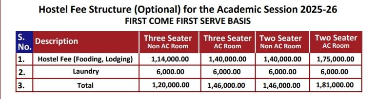 My hostel fee is 97,000 and my room is three seaters without AC. The room is quite big and nice. The attached bathroom and washroom are also there for girls. But for boys, they dont have an attached washroom and their fee for a seater room without AC is 89000. Mess food is okay like i am having stomach issues because of that But the taste is okay you can eat it.
