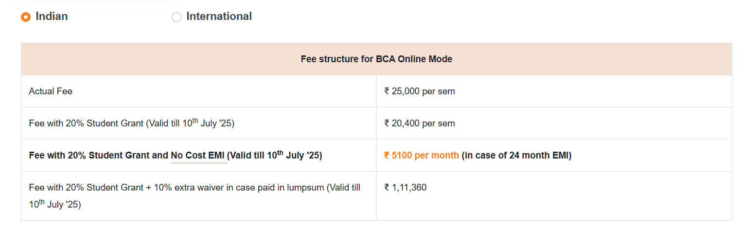 Earlier, BCA fees at LPU Online Jalandhar was ₹ 1.8 Lakhs (in 2024) for the entire course duration. This shows a fee decrease of ₹ 30,000 over the year.