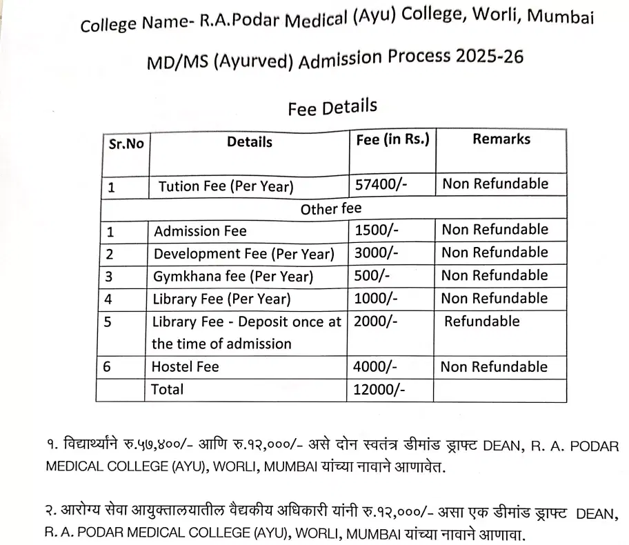 Find detailed R.A. Podar Ayurved Medical College Mumbai M.D Dravya Guna fees, eligibility, admission dates, cutoff and ranking below.