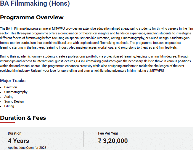 - The total fees for BA {Hons.} Film Making is ₹ 12.8 Lakhs.