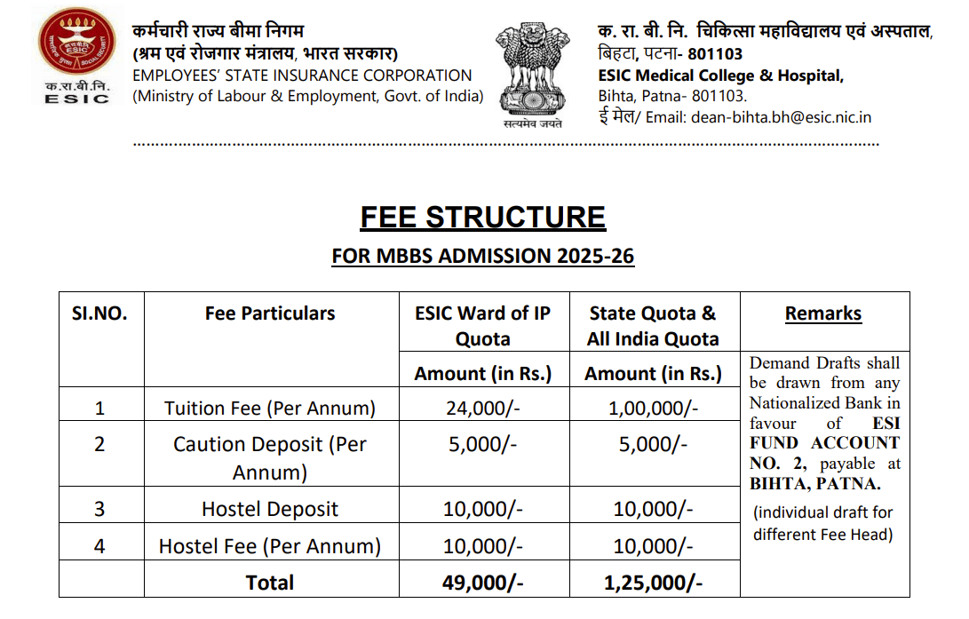 Find detailed ESIC Medical College Bihta MBBS fees, eligibility, admission dates, cutoff and ranking below.