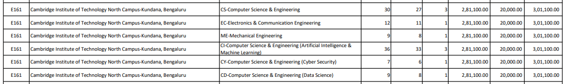 Cambridge Institute of Technology North Campus Bangalore BE Cyber Security Fee has not been released yet. For reference you can check the previous year academic fees in the section below.