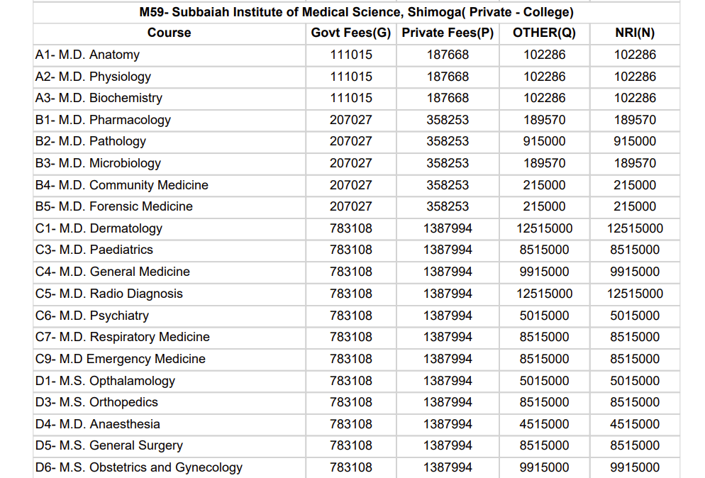 Admissions to M.S General Surgery at Subbaiah Institute of Medical Sciences Shimoga are primarily based on Karnataka-NEET-PG-Counselling. Candidates must have completed MBBS + NEET-PG to be eligible for admission. The overall Karnataka-NEET-PG-Counselling cutoff for the M.S General Surgery program is 21100 - 29553 across all categories.