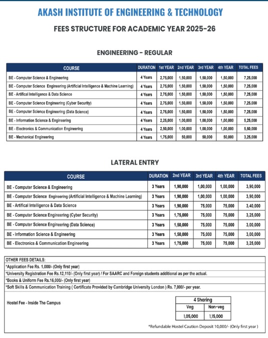 BE {Lateral} Computer Science & Engineering at Akash Institute Of Engineering & Technology Bangalore is a 3 Years Degree. The course is offered On Campus as a Full Time program. Akash Institute Of Engineering & Technology Bangalore BE {Lateral} Computer Science & Engineering First Year Fees is INR 2,23,610 for 2025.