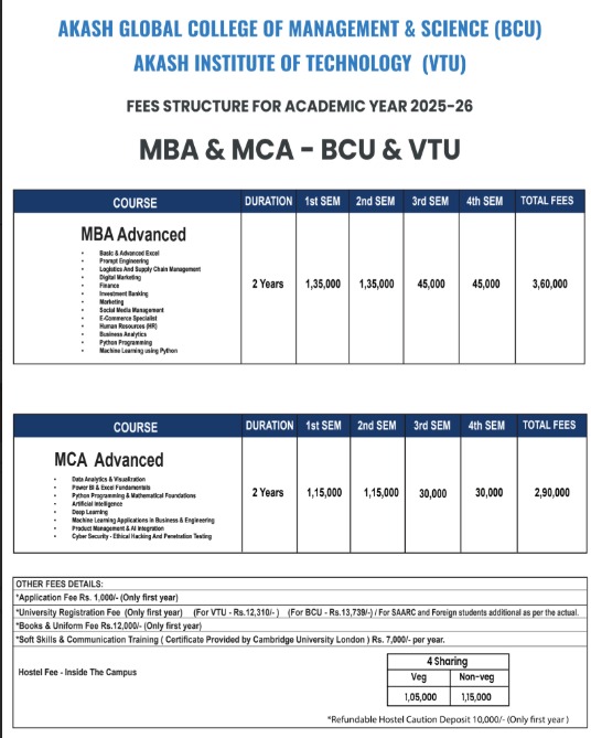 MBA at Akash Institute Of Engineering & Technology Bangalore is a 2 Years Degree. The course is offered On Campus as a Full Time program. Akash Institute Of Engineering & Technology Bangalore MBA First Year Fees is INR 1,29,810 for 2025.