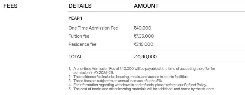 The total fee for Year 1 is Rs 10,90,000, which includes a one-time admission fee of Rs 40,000, a tuition fee of Rs 7,35,000, and a residence fee of Rs 3,15,000. The residence fee covers housing, meals, and access to sports facilities. Fees are subject to an annual increase of up to 8%. Books and learning materials are additional and borne by the student. Withdrawals and refunds are governed by the institution’s refund policy.