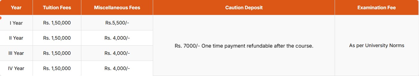 | Fees (2025 - 2026) | Year 1 (in INR) | Year 2 (in INR) | Year 3 (in INR) | Year 4 (in INR) |