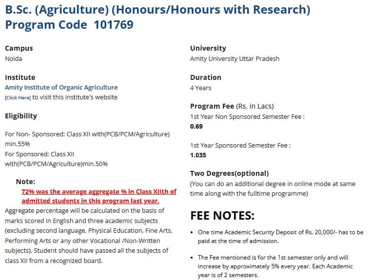 Amity Institute of Organic Agriculture Noida B.Sc {Hons.} Agriculture is offered as 4 Years Full Time program. The minimum eligibility criteria for B.Sc {Hons.} is 10+2 with 55%. The total fees for Amity Institute of Organic Agriculture Noida B.Sc {Hons.} Agriculture in 2025 is ₹ 5.2 Lakhs for the complete course duration, which includes total tuition fees of ₹ 5.2 Lakhs. Earlier, the fees in 2024 - 2025 for B.Sc {Hons.} Agriculture was ₹ 5.12 Lakhs.