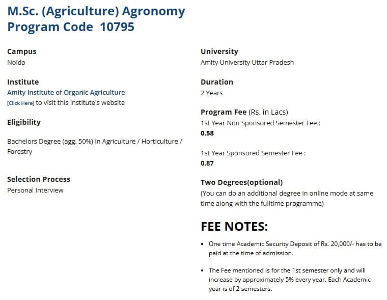 Earlier, M.Sc Agronomy fees at Amity Institute of Organic Agriculture Noida was ₹ 2.14 Lakhs (in 2025) for the entire course duration. This shows a fee increase of ₹ 38,000 over the year.