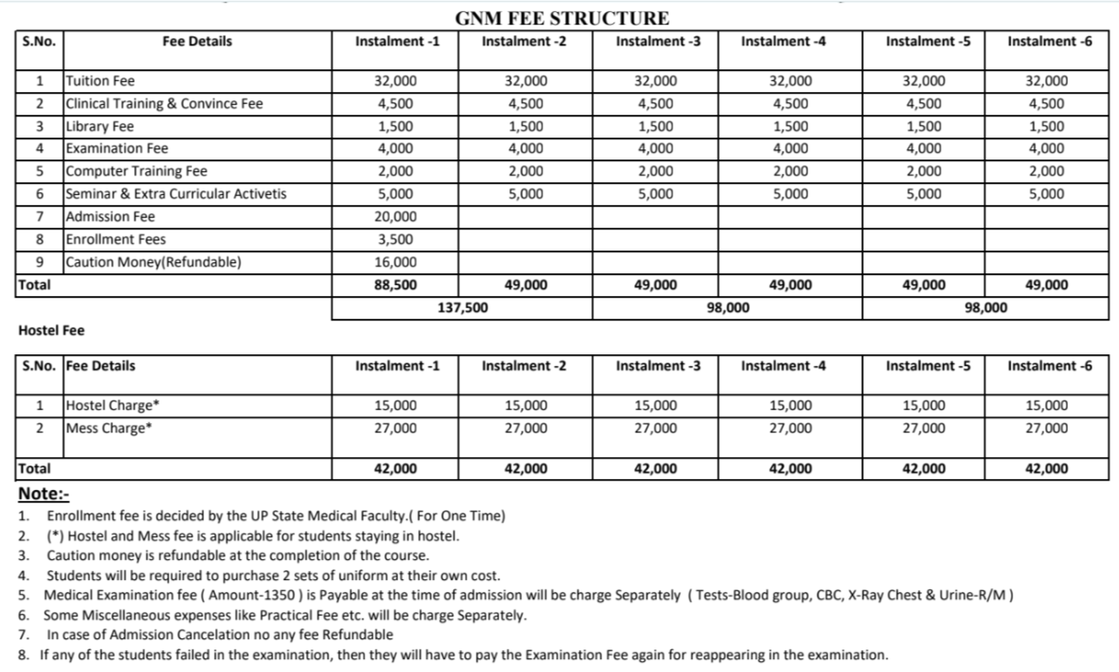 GNM at is a 3 Years 6 Months Degree. The course is offered On Campus as a Full Time program. GNM First Year Fees is INR 1,37,500 for 2025.