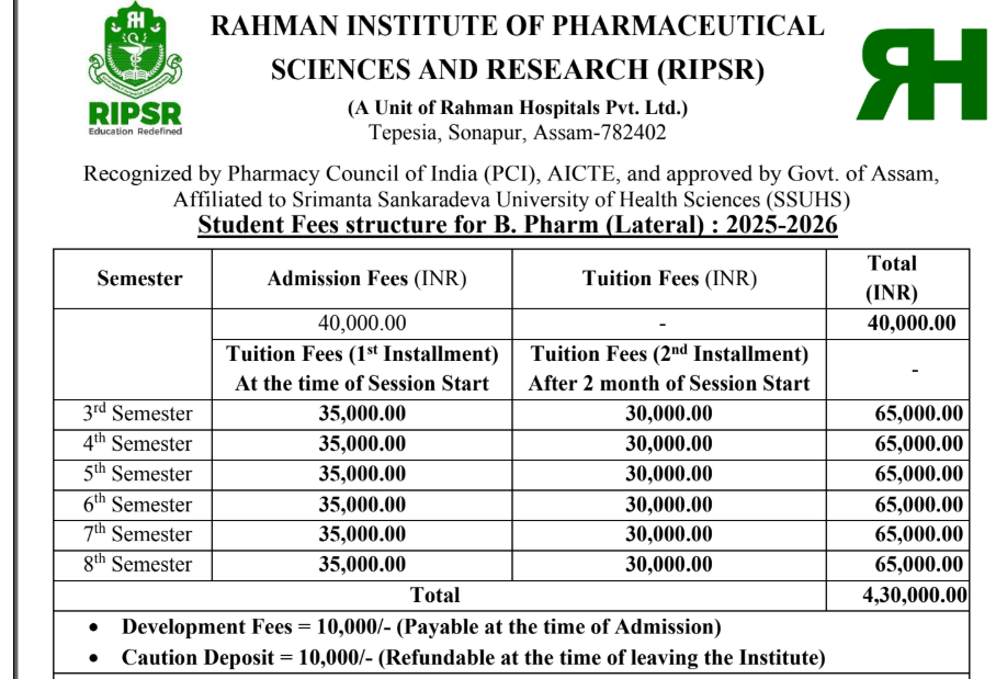 Rahman Institute of Pharmaceutical Sciences and Research (RIPSR) B.Pharma {Lateral} is offered as 3 Years Full Time program. The minimum eligibility criteria for B.Pharma {Lateral} is D.Pharm.
