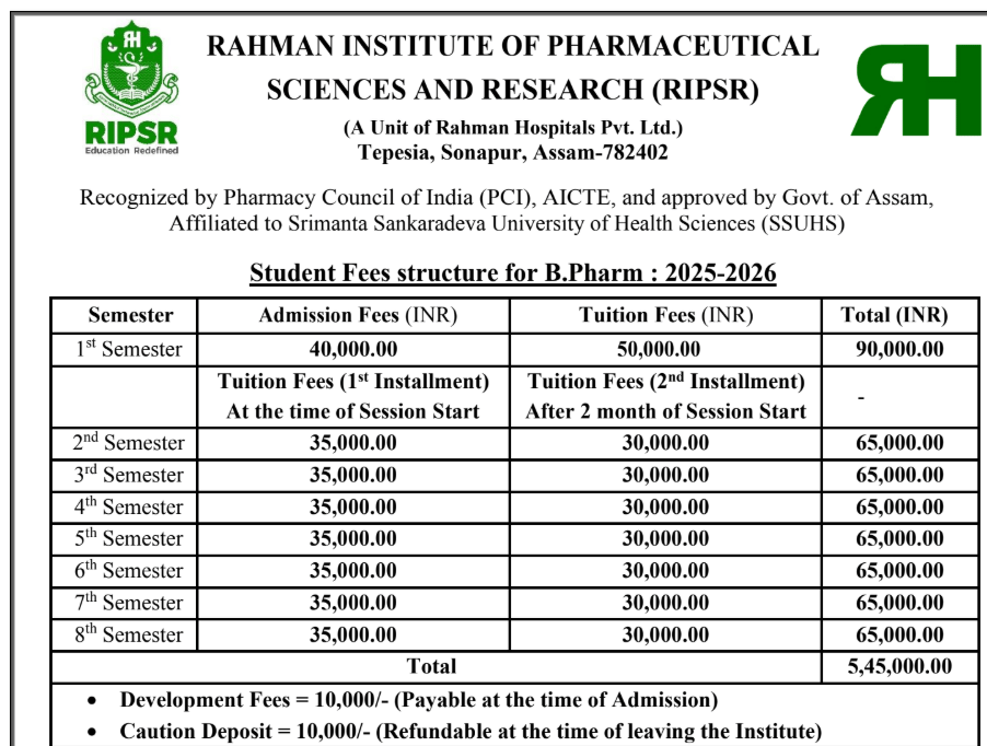 Rahman Institute of Pharmaceutical Sciences and Research (RIPSR) Hostel Fee is ₹ 8,000.