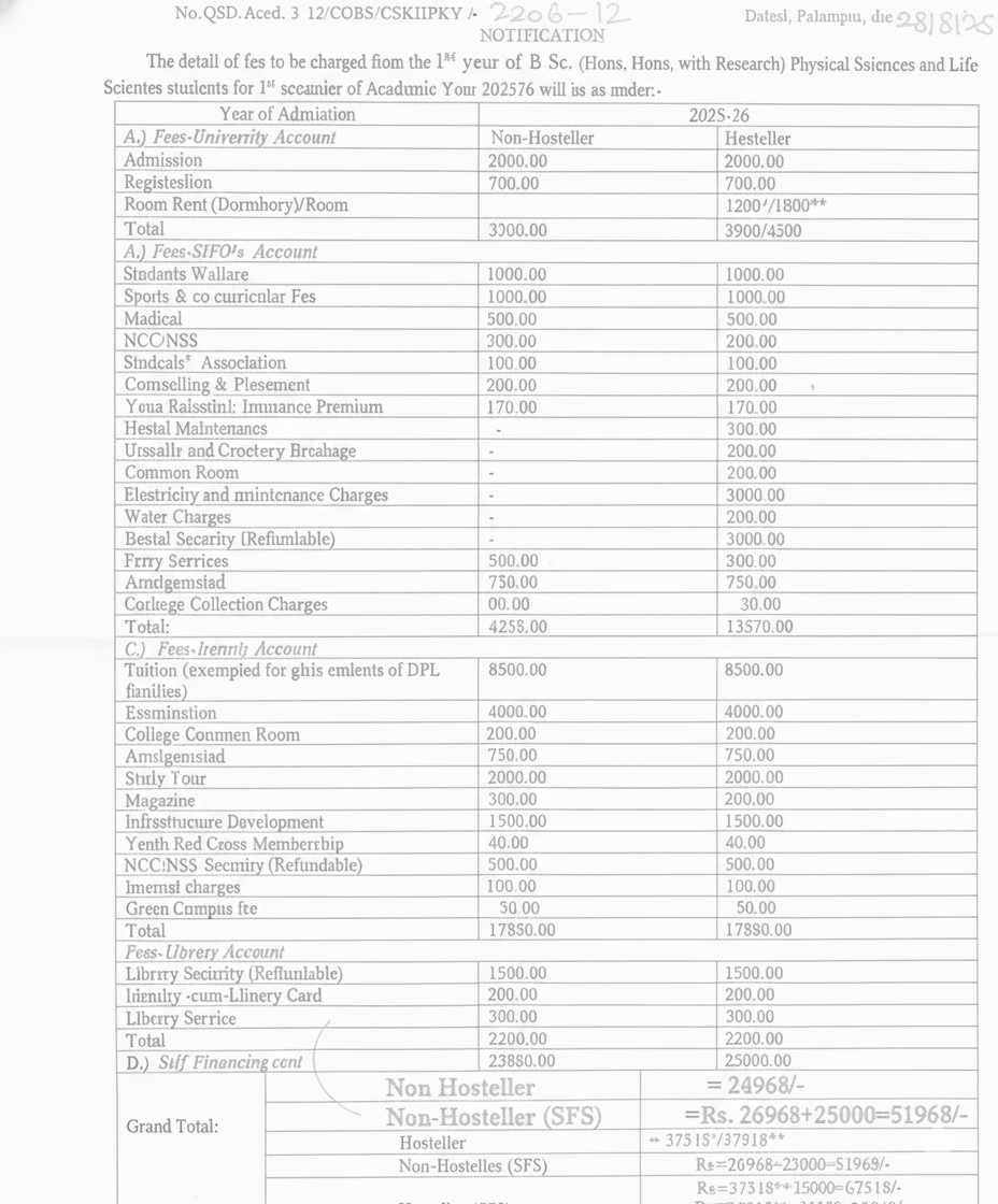College of Basic Sciences Palampur B.Sc Physical Sciences fees 2025 is ₹ 73,704 for the entire course duration.