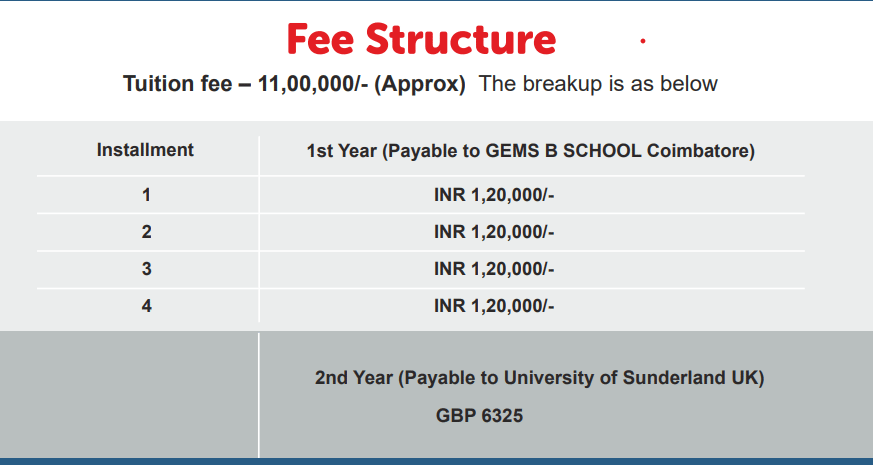 GEMS B School Coimbatore MBA Global Business Management fees 2025 is ₹ 11 Lakhs for the entire course duration.