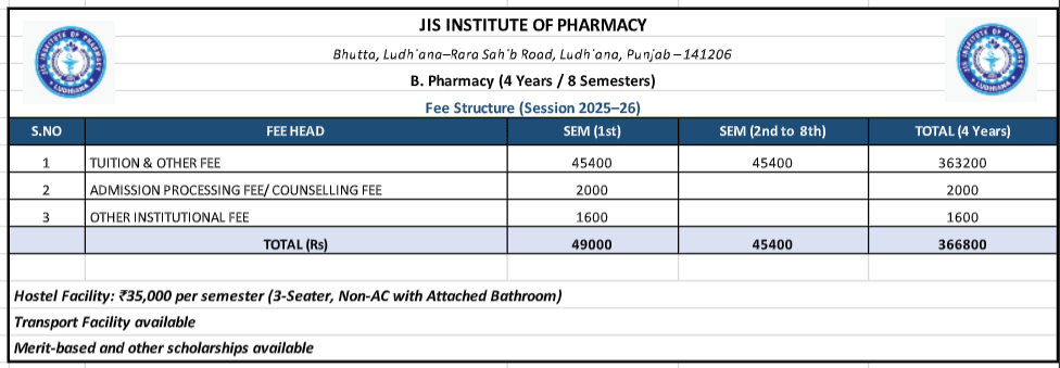 JIS Institute of Pharmacy B Pharma fees 2025 is ₹ 3.67 Lakhs for the entire course duration.
