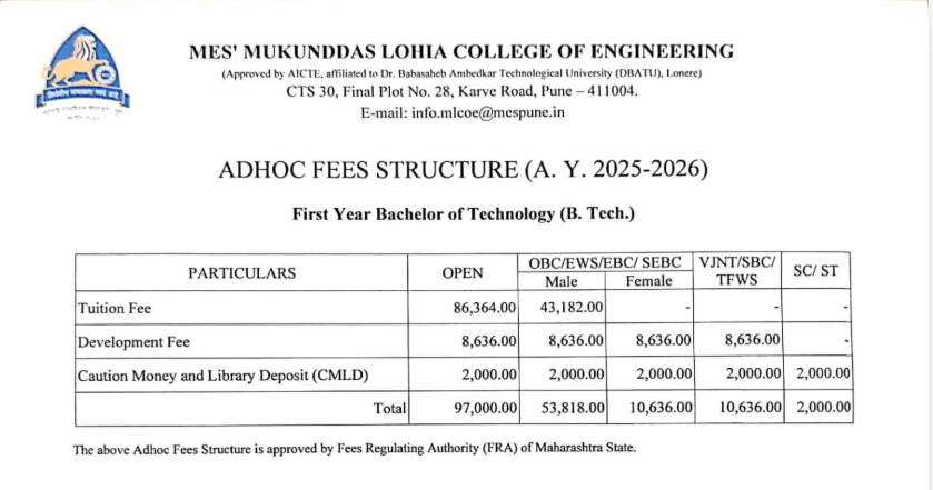 MES Mukunddas Lohia College of Engineering Pune B.Tech Computer Engineering fees 2025 is ₹ 3.82 Lakhs for the entire course duration.