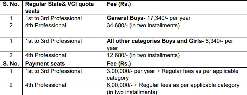 College of Veterinary and Animal Sciences Bikaner B.V.Sc Animal Husbandry Fee has not been released yet. For reference you can check the previous year academic fees in the section below.