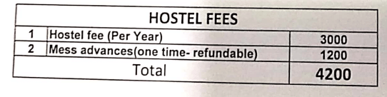 Hostel facility was good. Separate hostel for all 3 year students. And the room was good. 4 students in a room 24*7 electricity and water facility. Also had a ladies hostel. We paid 2500 for one year.