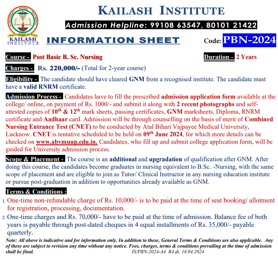 Kailash Institute of Nursing and Paramedical Sciences Greater Noida P.B.B.Sc Nursing Fee has not been released yet. For reference you can check the previous year academic fees in the section below.