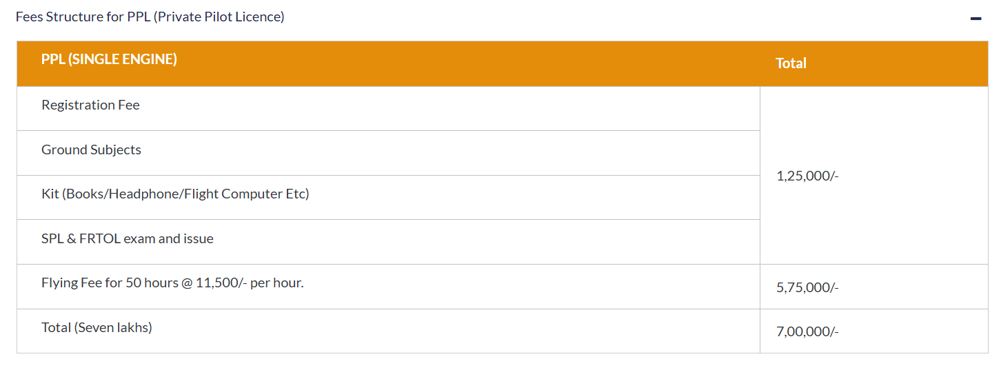 Ahmedabad Aviation and Aeronautics Limited PPL is offered as 6 Months Full Time program. The minimum eligibility criteria for PPL is 10th. The total fees for Ahmedabad Aviation and Aeronautics Limited PPL in 2020 is ₹ 7 Lakhs for the complete course duration.