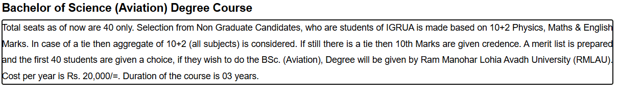 Indira Gandhi Rashtriya Uran Academy (IGRUA) offers a B.Sc. Aviation course requiring applicants to have completed 10+2 in the science stream with at least 55% in Physics and Mathematics. The admission process includes an Online Written Test, Pilot Aptitude Test, and Viva/Interview, with successful candidates needing a Class I Medical Certificate. The course lasts three years and includes comprehensive training such as 565 hours of lectures on Commercial Pilot License, 200 hours of flying training, and various workshops.