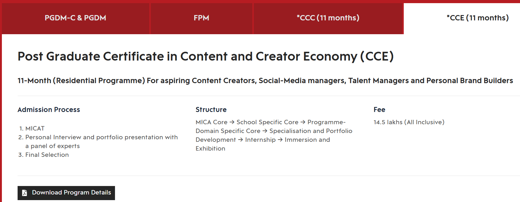 Find detailed MICA PG Programme Content & Creator Economy fees, eligibility, admission dates, cutoff and ranking below.