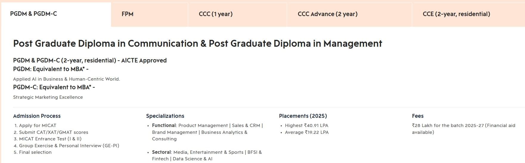 The two-year, residential, AICTE-approved Post Graduate Diploma in Management (PGDM) and Post Graduate Diploma in Communication (PGDM-C) programs, both equivalent to an MBA, with the PGDM focusing on Applied AI and the PGDM-C on Strategic Marketing Excellence. The admission process involves applying for MICAT, submitting CAT/XAT/GMAT scores, taking the MICAT Entrance Test (I & II), participating in a Group Exercise & Personal Interview (GE-PI), and final selection. The programs offer specializations in both Functional areas (Product Management, Sales & CRM, Brand Management, Business Analytics & Consulting) and Sectoral areas (Media, Entertainment & Sports, BFSI & Fintech, Data Science & AI). Placement data for 2025 shows a highest package of 40.91 LPA and an average package of 19.22 LPA, while the fees for the 2025-27 batch are listed at 28 Lakh, with financial aid options available.