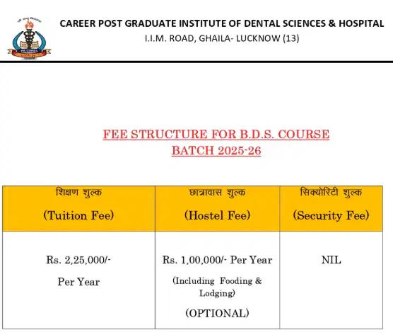 Career Post Graduate Institute of Dental Sciences and Hospital Lucknow BDS is offered as 4 Years Full Time program, with total intake of 100 seats. The minimum eligibility criteria for BDS is 10+2. The total fees for Career Post Graduate Institute of Dental Sciences and Hospital Lucknow BDS in 2025 is ₹ 9 Lakhs for the complete course duration, which includes total tuition fees of ₹ 9 Lakhs. Earlier, the fees in 2024 - 2025 for BDS was ₹ 9.95 Lakhs.