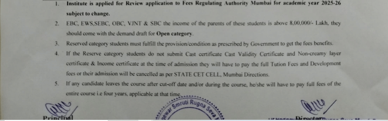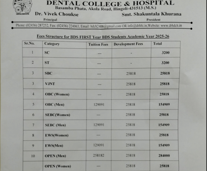 Dr Hedgewar Smruti Rugna Sewa Mandal's College Hingoli BDS fees in first year is ₹ 2.06 Lakhs. The detailed fees is mentioned below.Admissions are offered based on Maharashtra-NEET-Counselling.