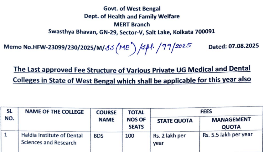 The Haldia Institute of Dental Sciences and Research offers a BDS program with a total of 100 seats. The approved fee structure for candidates admitted under the State Quota is INR 2 lakh per year, while the fees for those admitted under the Management Quota are INR5.5 lakh per year. It is important for a candidate to note that this fee structure, dated 07.08.2025, is the last approved one and shall also be applicable for the current academic year, though these fees may be subject to future changes.