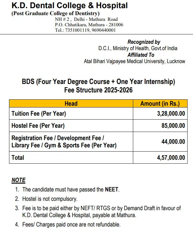 KD Dental College and Hospital Mathura BDS is offered as 4 Years Full Time program, with total intake of 100 seats. The minimum eligibility criteria for BDS is 10+2+NEET. The total fees for KD Dental College and Hospital Mathura BDS in 2025 is ₹ 14.88 Lakhs for the complete course duration, which includes total tuition fees of ₹ 13.12 Lakhs. Earlier, the fees in 2024 - 2025 for BDS was ₹ 8.07 Lakhs.