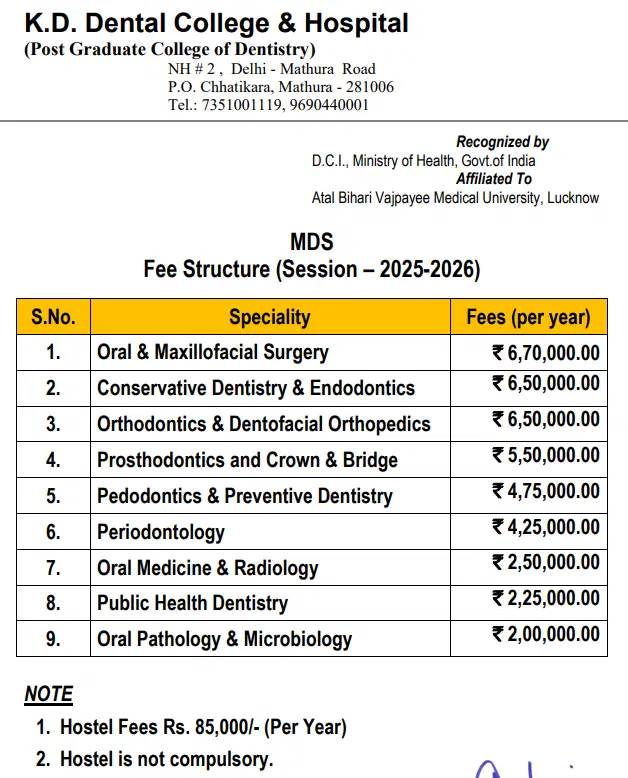 KD Dental College and Hospital Mathura Hostel Fee is ₹ 85,000.