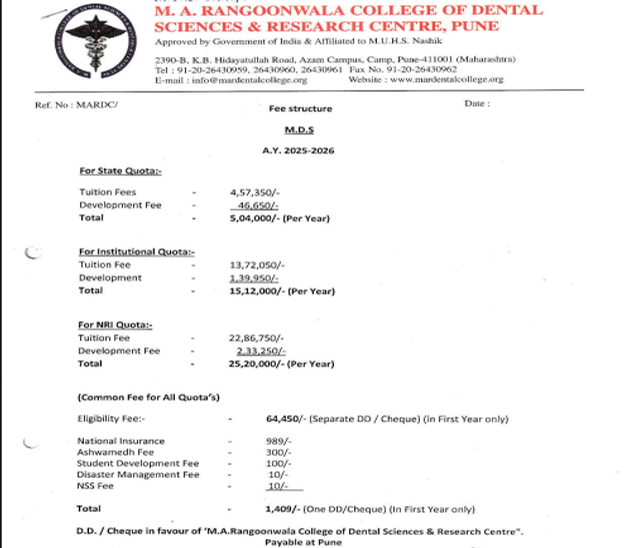 MA Rangoonwala College of Dental Sciences and Research Centre Pune MDS Oral And Maxillofacial Pathology is offered as 3 Years Full Time program. The minimum eligibility criteria for MDS is B.D.S.. The total fees for MA Rangoonwala College of Dental Sciences and Research Centre Pune MDS Oral And Maxillofacial Pathology in 2020 is ₹ 19.2 Lakhs for the complete course duration, which includes total tuition fees of ₹ 17.45 Lakhs.