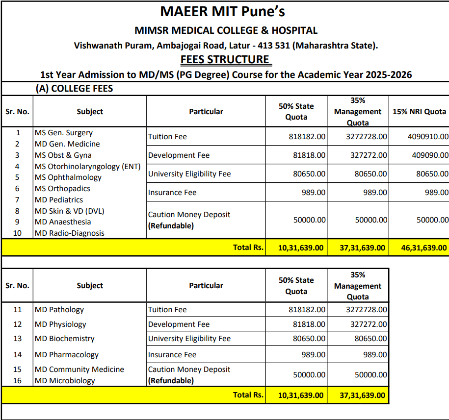 Maharashtra Institute of Medical Sciences and Research Latur M.D Anaesthesia fees in first year is ₹ 9 Lakhs. The detailed fees is mentioned below.Maharashtra Institute of Medical Sciences and Research Latur Hostel Fee is ₹ 40,000 to 1.3 Lakhs.