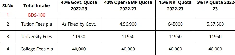 The BDS program has an intake of 100 seats with different fee structures based on quota. Under the Government Quota, tuition fees are fixed by the government, along with Rs 11,950 as university fees and Rs 40,000 as college fees per year. For the Open/GMP Quota, the tuition fee is Rs 4,56,900 per year, plus Rs 11,950 university fees and Rs 40,000 college fees. Under the NRI Quota, the tuition fee is Rs 6,45,000 per year, along with the same Rs 11,950 university fees and Rs 40,000 college fees. For the IP Quota, the tuition fee is Rs 5,37,500 per year, plus Rs 11,950 university fees and Rs 40,000 college fees.
