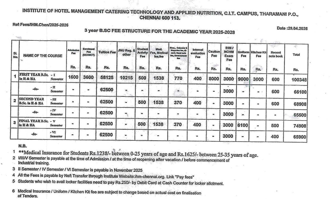 Earlier, B.Sc(HHA) Hospitality And Hotel Administration fees at Institute of Hotel Management Catering Technology and Applied Nutrition Chennai was ₹ 3.38 Lakhs (in 2024) for the entire course duration. This shows a fee increase of ₹ 1.04 Lakhs over the year.