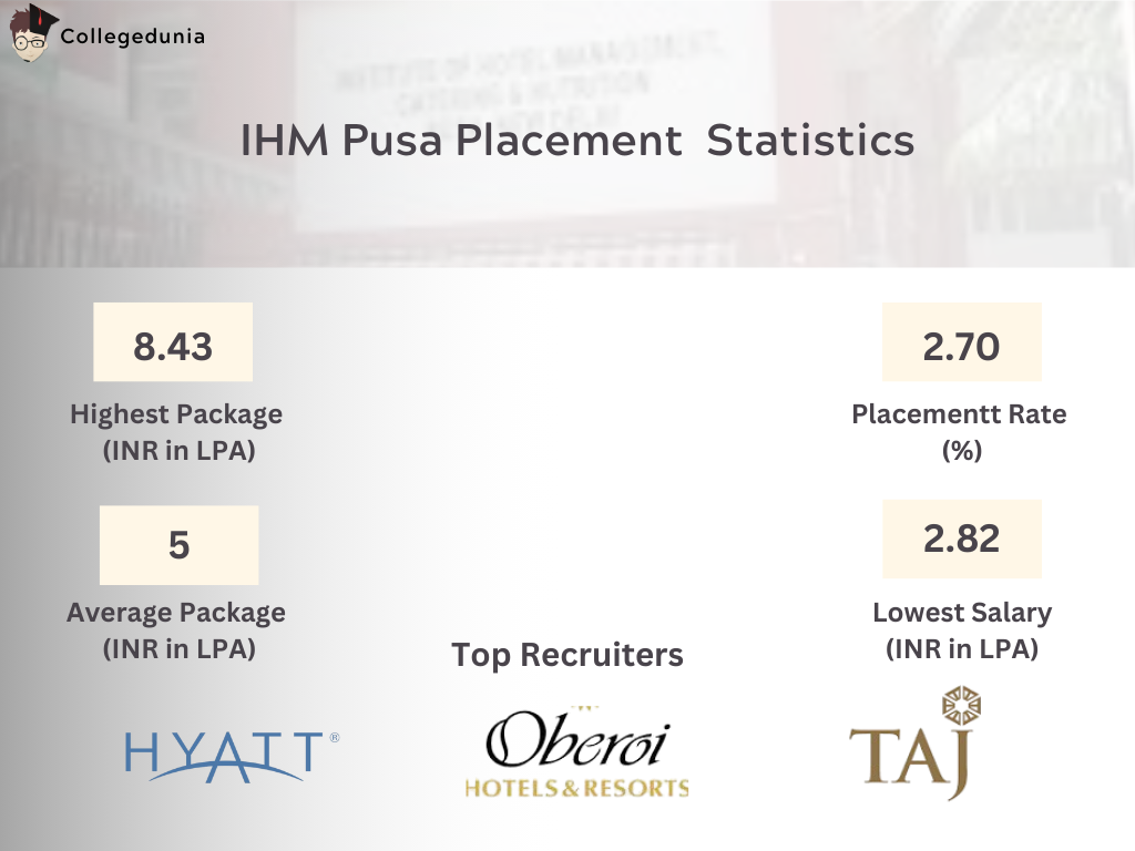 The IHM Pusa Placement 2025 report has not been released yet. However, In 2024, 81 Companies visited the IHM Pusa campus with the highest salary offered was INR 8.43 LPA and average salary offered was INR 5 LPA. Out of 301 students, 233 students opted for placements with 97.42% of placement records. ABFRL, APPAREL Group, CAFE COFFEE DAY, Dunkin Corporate, Hilton, Hyatt, Indigo Airlines and many more are the top recruiters at IHM Pusa.