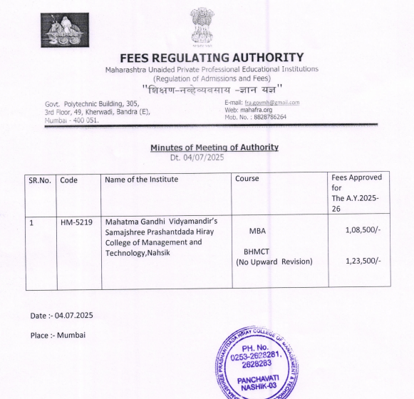 MGV's Samajshree Prashantdada HirayCollege of Hotel Management & Catering Technology Panchavati Nashik MBA is offered as 2 Years Full Time program. The minimum eligibility criteria for MBA is Graduation. The total fees for MGV's Samajshree Prashantdada HirayCollege of Hotel Management & Catering Technology Panchavati Nashik MBA in 2025 is ₹ 2.17 Lakhs for the complete course duration, which includes total tuition fees of ₹ 2.17 Lakhs.