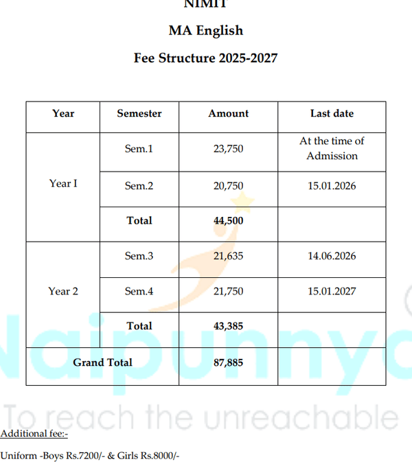 Naipunnya Institute of Management and Information Technology Thrissur MA English fees 2025 is ₹ 1.03 Lakhs for the entire course duration.