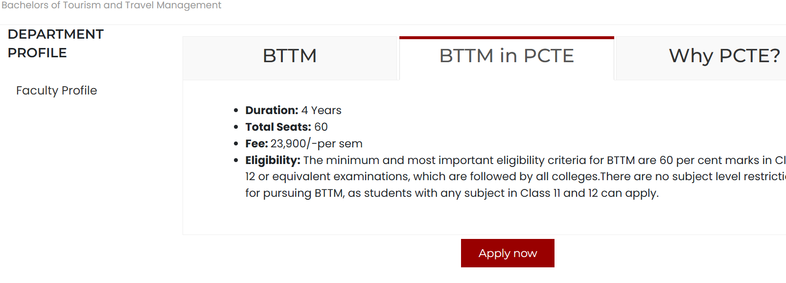 BTTM at PCTE Institute of Hotel Management Ludhiana is a 4 Years Degree. The course is offered On Campus as a Full Time program. PCTE Institute of Hotel Management Ludhiana BTTM First Year Fees is INR 47,800 for 2025.