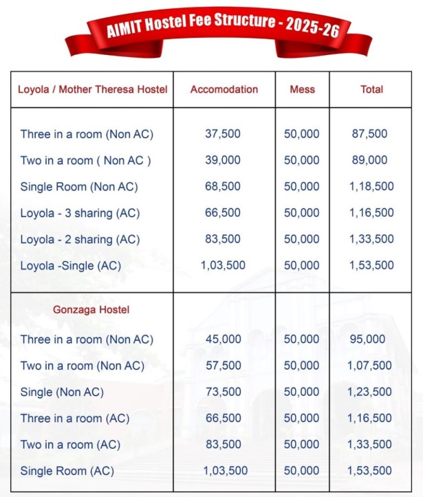 St Aloysius (Deemed To Be University) Institute of Management and Information Technology Mangalore Hostel Fees 2025, Facilities, Rooms, Food, Photos